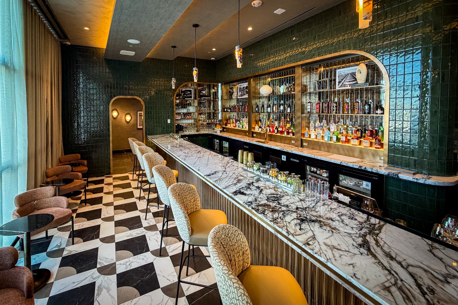 The design itself evokes a sense of desert tranquility, blending shimmering brass accents with rich, earthy tones and subtle nods to the iconic Amex blue. Vintage Las Vegas photographs add a touch of nostalgia, creating an oasis removed from the terminal’s energy.